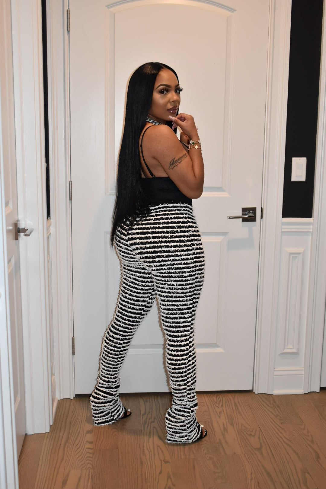 Black/white leggings has slight stretch so SIZE UP!. Model is usually a size small but is wearing a medium in these.