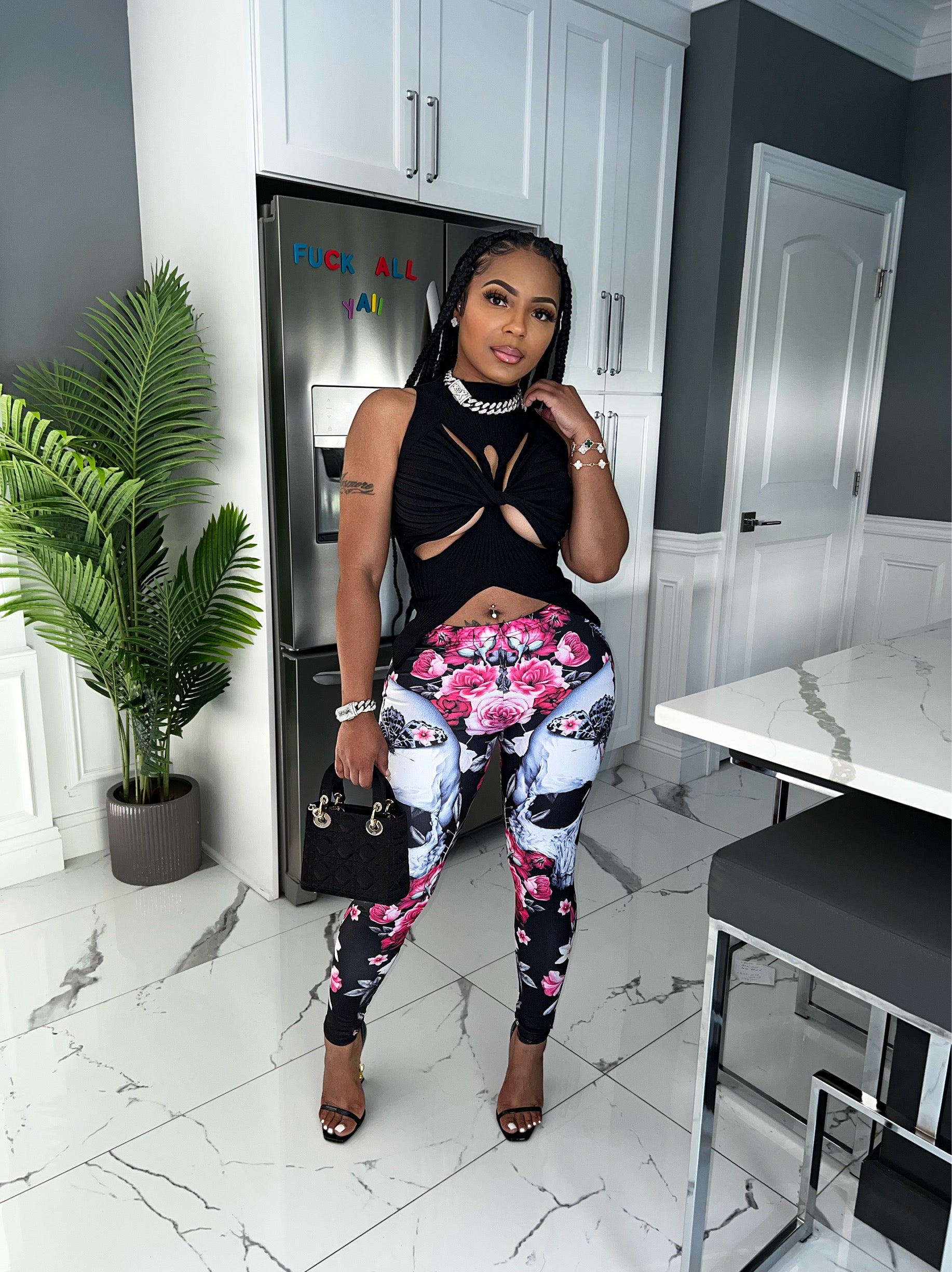 Flower, skull leggings.